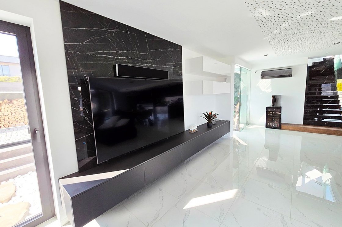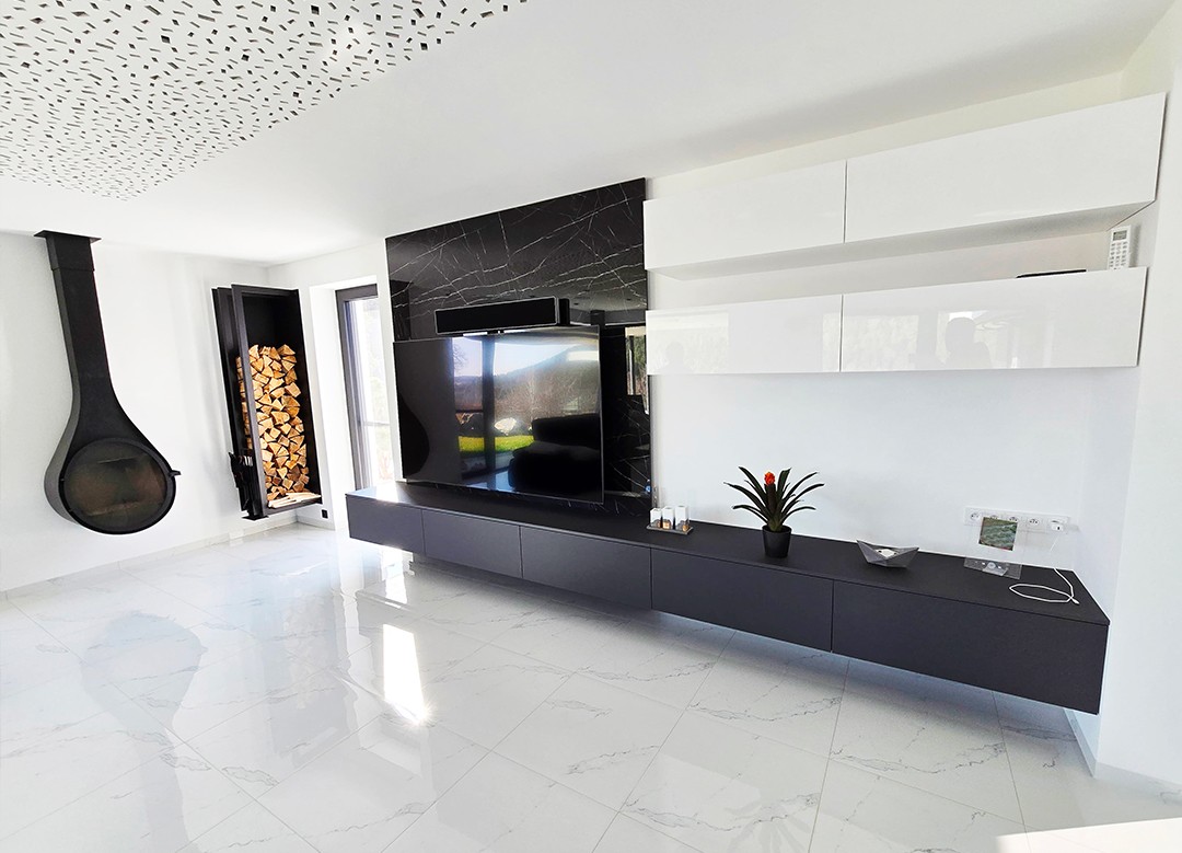 Do obývacího pokoje moderní vily jsme navrhli a vyrobili nábytek na míru převážně z bílého lesklého materiálu, který prostoru dodává lehkost a vzdušnost.