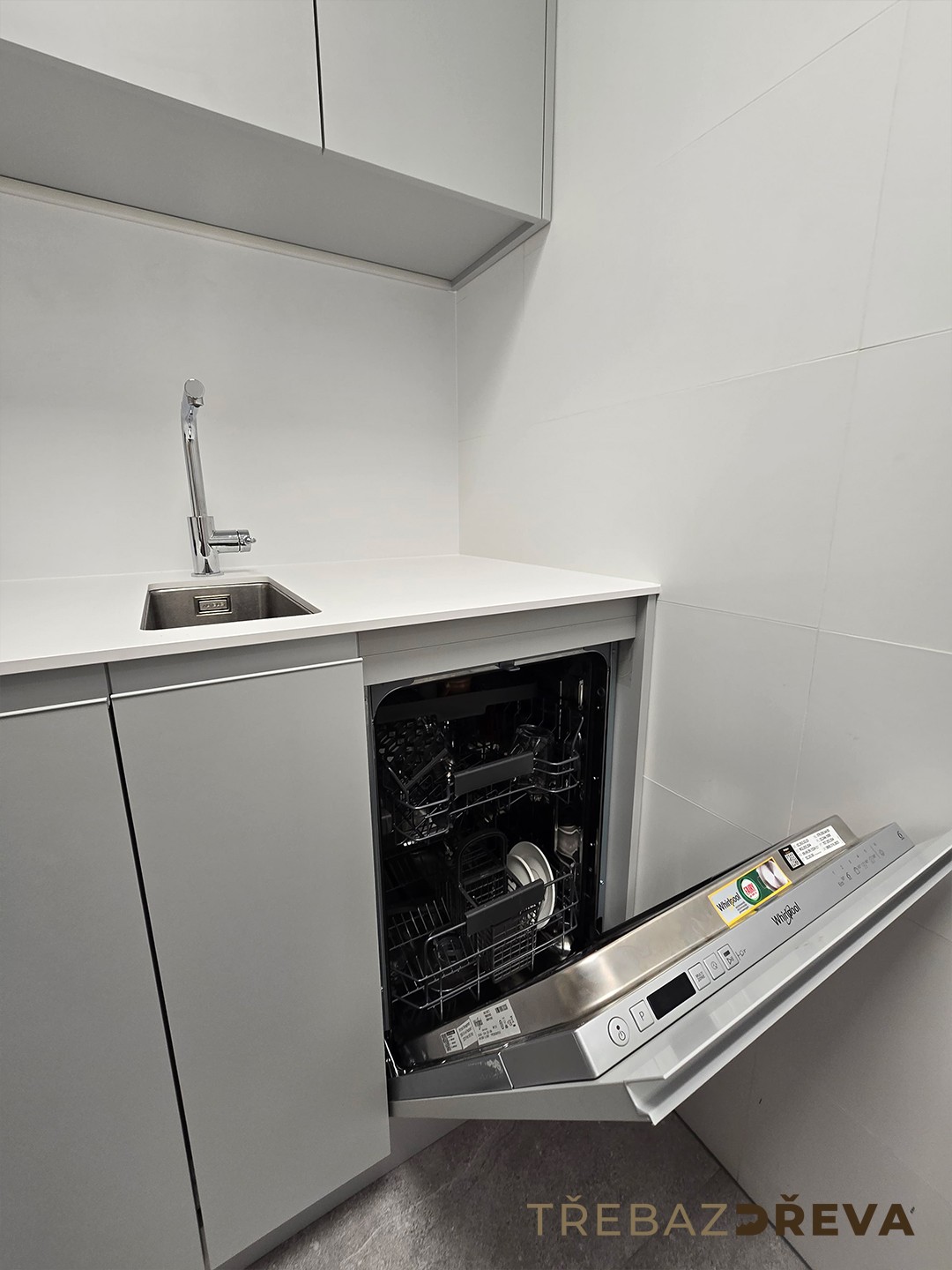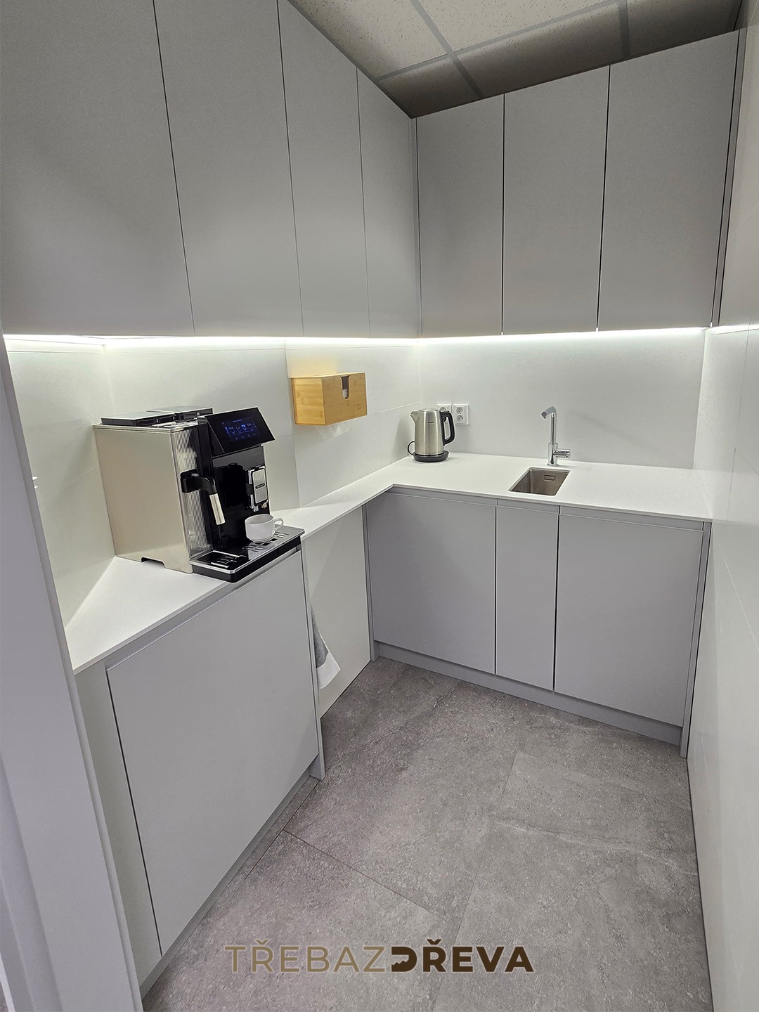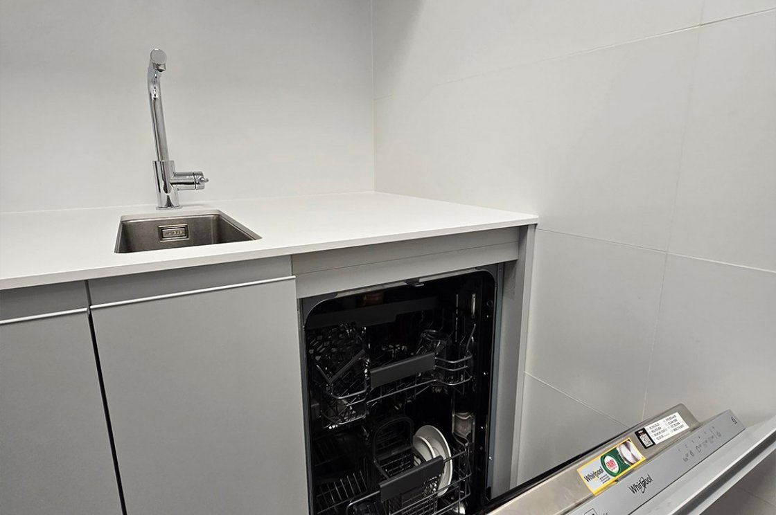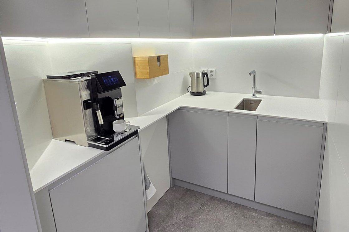 Kuchyňka, dveře včetně zárubní i nábytek na toalety jsou sjednocené do minimalistického stylu, který dává smysl při každodenním provozu.